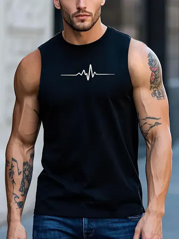 Heartbeat Graphic Tank Top, Men's Black Sleeveless Tank Top with Heartbeat Graphic- Breathable, Machine Washable, Casual Summer Workout Vest.